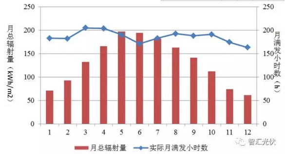 從上圖可以看出,該地月總輻射量最高的是5月、6月,但月滿發(fā)小時數(shù)最高的卻是4月、3月;其次是9月、10月。
