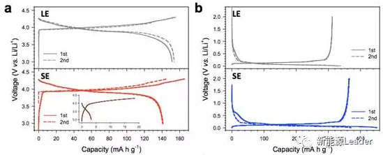 DongHyeonKim將上述制備的正負(fù)極電極分別制成半電池進(jìn)行電化學(xué)測(cè)試,測(cè)試結(jié)果如下圖所示,從結(jié)果上我們看到,對(duì)于正極LCO材料,采用固體電解質(zhì)的實(shí)驗(yàn)電池比容量為141mAh/g,而采用液體電解質(zhì)的對(duì)照組比容量為154mAh/g,而對(duì)于負(fù)極石墨,采用固體電解質(zhì)的實(shí)驗(yàn)電池的比容量為364mAh/g,采用液體電解質(zhì)的對(duì)照組僅為312mAh/g,但是固態(tài)電解質(zhì)電池的首效都較低(正極76.6%,負(fù)極80.7%),這與硫化物固體電解質(zhì)在高電壓和低電壓下不穩(wěn)定有關(guān),首次充電的過程中,部分Li+不可逆的嵌入到固體電解質(zhì)中,但是隨后形成的惰性分解產(chǎn)物能夠?qū)腆w電解質(zhì)祈禱保護(hù)作用,防止其進(jìn)一步分解。