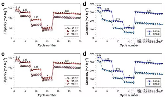 該固體電解質(zhì)的倍率性能測(cè)試如下圖所示,從結(jié)果來看,降低PVDF粘結(jié)劑的含量,可以有效的提升電池的倍率性能,這主要是因?yàn)檩^低的PVDF粘結(jié)劑含量,有助于提升固體電解質(zhì)與活性物質(zhì)之間的離子電導(dǎo)率,從而改善電池的倍率性能。但是降低導(dǎo)電劑SP的含量卻會(huì)導(dǎo)致倍率性能下降,這可能是因?yàn)殡姌O的電子導(dǎo)電性下降導(dǎo)致的。
