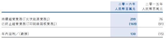協(xié)鑫新能源(0451.HK)于2014年5月9日完成重組交易,在香港主板借殼上市。2016年12月30日,協(xié)鑫新能源發(fā)布公告稱,公司將集中資源發(fā)展光伏能源業(yè)務(wù),不再從事印刷線路板業(yè)務(wù)。故出售印刷線路板業(yè)務(wù)的全部股權(quán),代價為2.5億港元。在發(fā)布的最新財報中,原印刷線路板業(yè)務(wù)經(jīng)營業(yè)績被劃分為已終止經(jīng)營業(yè)務(wù)。下表截圖為2015-2016年協(xié)鑫新能源主營業(yè)務(wù)構(gòu)成: