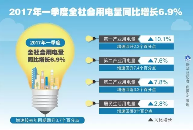 4月13日,國家發(fā)改委發(fā)布消息,今年一季度全社會用電量約1.45萬億度,同比增長6.9%。