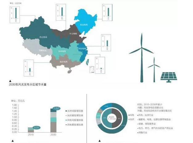 并且中國的煤炭資源和水資源多呈逆向分布。煤炭的開采、洗選和發(fā)電都高度耗水。過度取水給當(dāng)?shù)氐纳鷳B(tài)環(huán)境和人體健康造成了巨大危害。與此相比,風(fēng)光發(fā)電的用水量要小得多。從全生命周期考慮,風(fēng)電和光伏發(fā)一兆瓦時(shí)的電力,將比燃煤發(fā)電分別節(jié)約用水2.76立方米和1.63立方米。據(jù)此計(jì)算,風(fēng)電和光伏發(fā)電的節(jié)水量將分別從2015年的5.11億立方米、0.62億立方米增長到2030年的27.05億立方米、8.8億立方米,節(jié)約的水資源相當(dāng)于2億人全年的用水需求。