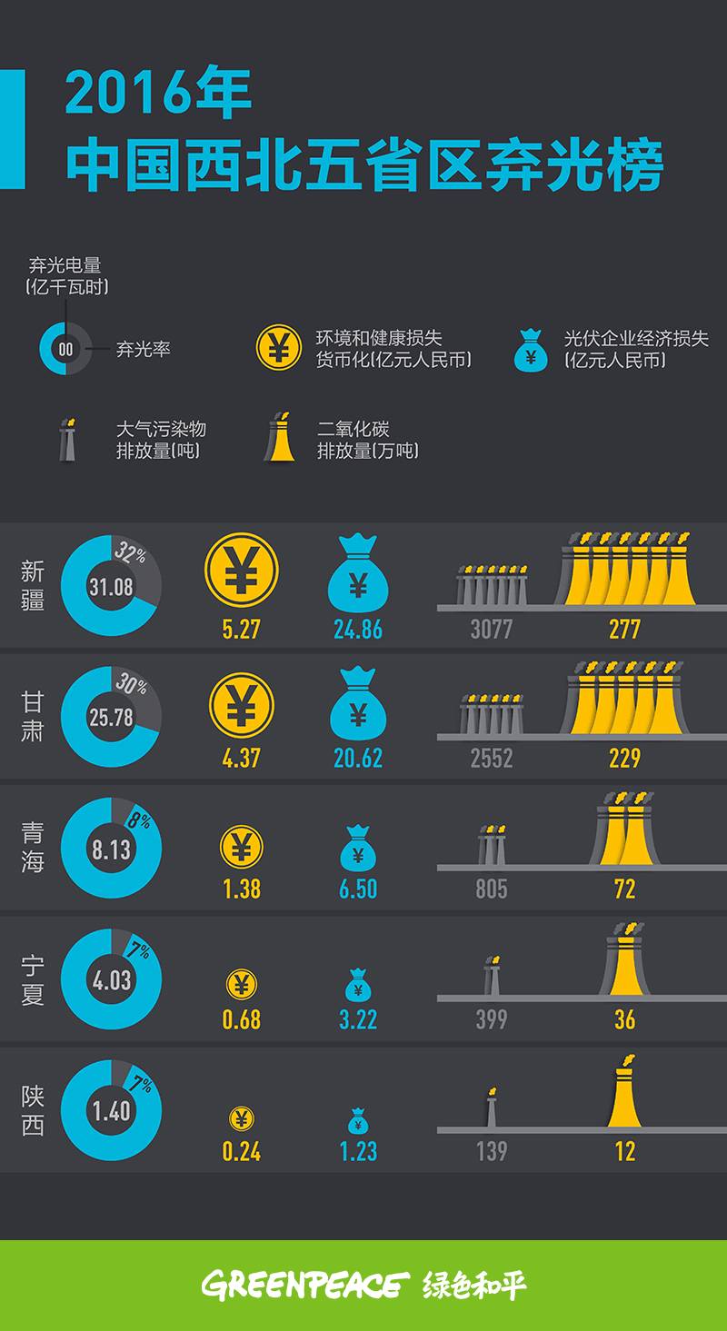 比對中國國家能源局在4月18日所發(fā)表的《2016年度全國可再生能源電力發(fā)展監(jiān)測評價的通報》,中國全國棄風量在2016年高達497億度,棄光量則達70.42億度。新疆的棄光率在2016年超越甘肅,前者達32%、后者達30%。據(jù)此,綠色和平組織完成了以下的資訊圖表: