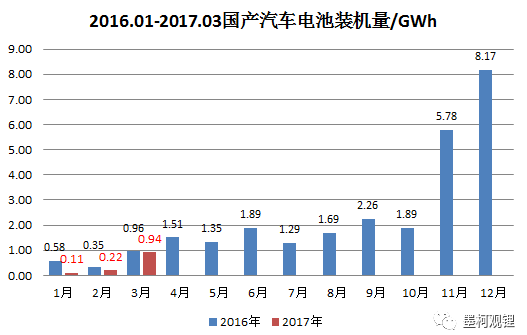 中國(guó)儲(chǔ)能網(wǎng)訊:2017年1季度國(guó)產(chǎn)電動(dòng)汽車的電池裝機(jī)量著實(shí)不多,只有127.4萬(wàn)kWh,同比下降了32.7%。大家現(xiàn)在一定很關(guān)心2017年全年的汽車電池裝機(jī)量會(huì)達(dá)到多少,這里,墨柯給出一些參考數(shù)據(jù),協(xié)助大家去判斷并做相關(guān)預(yù)測(cè)。