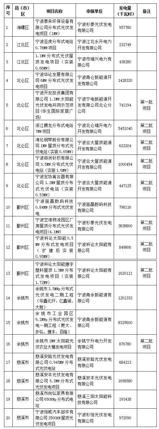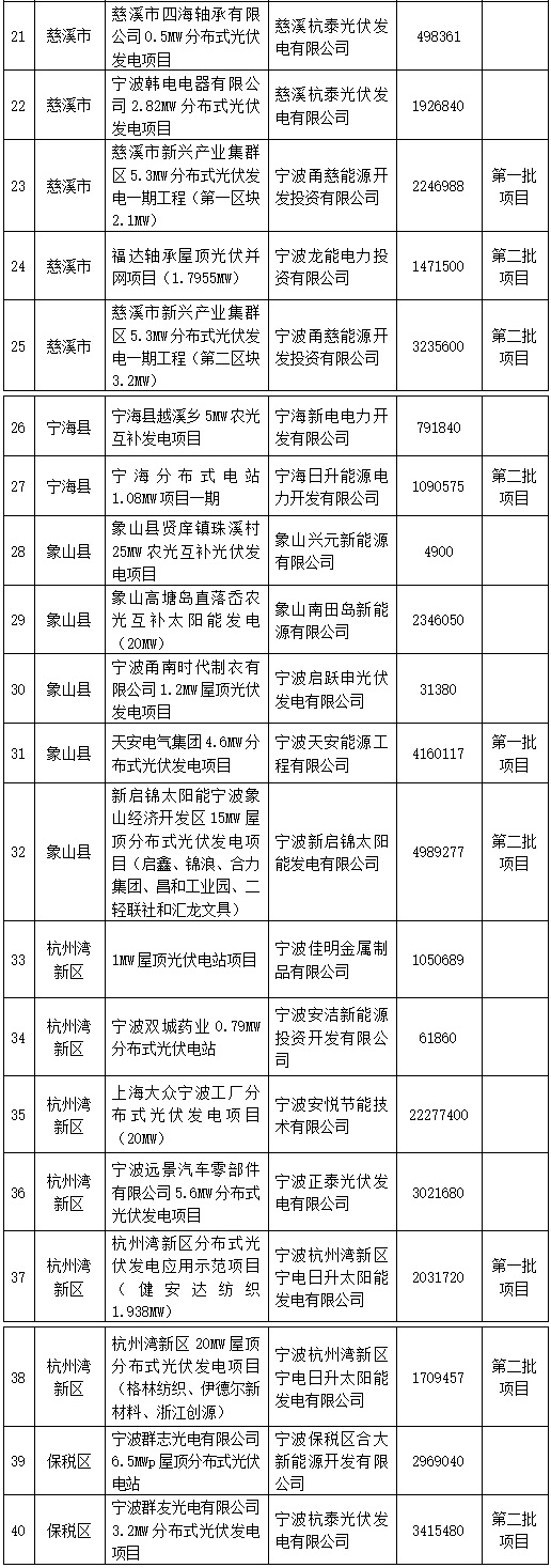 寧波市光伏發(fā)電補貼資金擬補助企業(yè)名單(第三批)