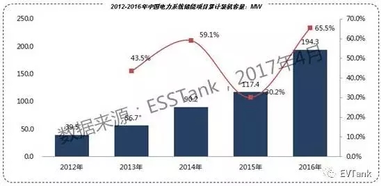 ESSTank分析認(rèn)為之所以有大量企業(yè)開始關(guān)注儲(chǔ)能市場,主要原因在于儲(chǔ)能在電力系統(tǒng)中有著廣泛的應(yīng)用前景。儲(chǔ)能系統(tǒng)在電力系統(tǒng)的發(fā)電、輸電、配電和用電等各個(gè)環(huán)節(jié)均存在較大的市場空間,但是由于成本、市場機(jī)制等多方面因素,目前在國內(nèi)仍以示范性的項(xiàng)目為主。從化學(xué)儲(chǔ)能裝機(jī)容量來看,截止到2016年年底,國內(nèi)電力系統(tǒng)化學(xué)儲(chǔ)能累計(jì)裝機(jī)容量達(dá)到194.3MW,同比增長65.5%。其中鋰離子電池占比達(dá)到75.5%。