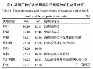 石墨的需求量隨鋼爐種類、使用部位和操作條件不同而異(表1)。歐洲多采用碳含量10%左右的鎂碳磚,而我國、日本一般都使用含碳量為12%~20%的鎂碳磚。
