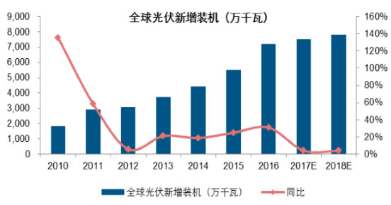 從全球光伏市場需求來看,經過前期的市場增長,目前中、日、美光伏裝機需求均逐步進入穩(wěn)態(tài)化發(fā)展,對于全球光伏裝機的增量貢獻逐步減弱。但是,受益于光伏成本的持續(xù)快速下降,光伏發(fā)電在印度、東南亞、南美等地區(qū)的優(yōu)勢逐步顯現,多個新興地區(qū)國家陸續(xù)出臺支持光伏發(fā)展的相關政策,帶動新興市場光伏裝機維持平穩(wěn)增長。整體來看,認為后期全球光伏需求仍將維持穩(wěn)定增長趨勢,預計2017、2018年全球光伏裝機有望達到75、80GW,年化增長5%左右。