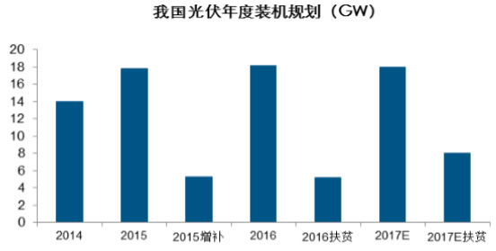 另一方面,隨著光伏扶貧模式逐步清晰、精準扶貧效果日益顯現等,我國明顯加大對光伏扶貧支持力度,2016年下發(fā)光伏扶貧規(guī)劃約4.5GW,2017年目標預計在8GW左右,光伏扶貧的快速增長同樣將為國內光伏行業(yè)裝機提供保證,預計后期國內光伏裝機仍將維持平穩(wěn)發(fā)展趨勢。