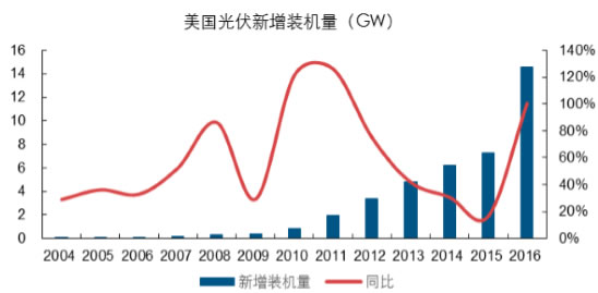 在補貼政策平穩(wěn)的背景下,近年來光伏發(fā)電成本持續(xù)下降,從而使得美國光伏電站投資回報率持續(xù)上行,帶動資金投資意愿上升,而這點將是保證后期美國市場平穩(wěn)增長的根本驅動力。近年來美國光伏裝機持續(xù)維持快速增長,預計后期增長趨勢仍將維持。