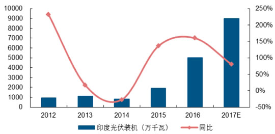 印度市場是后期全球光伏主要的新增市場之一,受益于政策支持,2015年印度實現光伏裝機約2GW。根據相關數據,預計2016印度裝機將達到4.8GW以上,2017年裝機有望沖擊8-10GW水平。