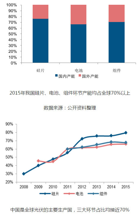 我國作為全球光伏產業(yè)鏈的主要生產國,2006年以來產業(yè)鏈市占率持續(xù)提升。目前,不管是硅片,還是電池組件,均在全球占據主力地位。根據數據,2015年我國硅片、電池、組件產能占比均超過70%,產量分別占到全球的79.60%、67.72%、66.02%。