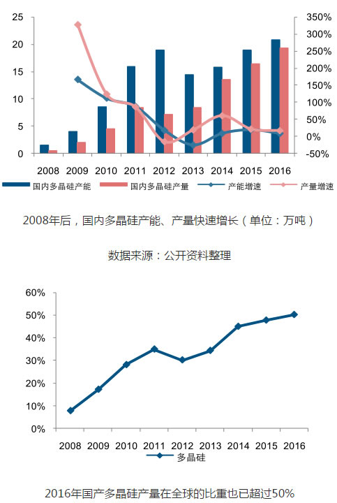 然而,相比于硅片-電池-組件產業(yè)鏈,國內多晶硅產業(yè)發(fā)展相對滯后,2008年以前國內多晶硅產量占全球產量不足10%,導致國內光伏產業(yè)長期受制海外硅料企業(yè)。此后,國內企業(yè)開始加速布局多晶硅產能,帶動國內多晶硅產量及占比持續(xù)提升,2016年國內多晶硅產量19.3萬噸,占世界總產量的50.26%。