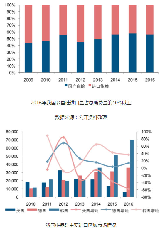 根據數據,2016年我國多晶硅進口14.1萬噸,同比增長25.67%,進口規(guī)模占總消費量的40%以上。其中,從韓國進口7.01萬噸,同比增長36.92%;從德國進口3.57萬噸,同比增長14.01%。從美國進口0.56萬噸,同比減少56.76%。