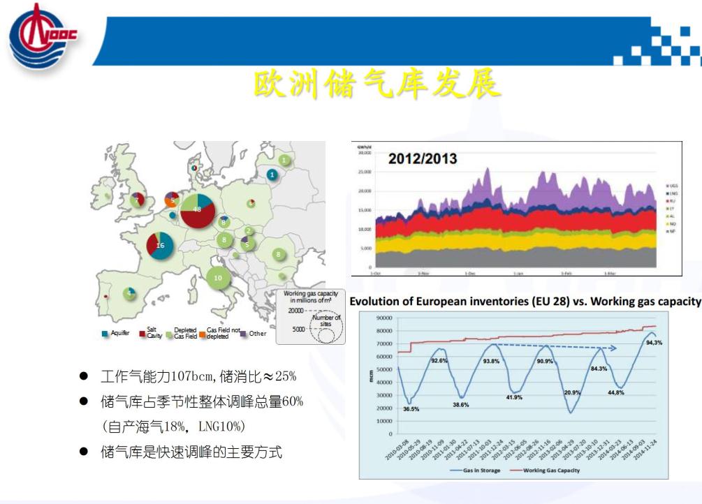歐洲的儲氣庫也是發(fā)展的比較早,英國北海的一個老氣田在海上采伐,采完之后就變成儲氣庫,現(xiàn)在冬季的采暖英國大部分都是靠那一個儲氣庫解決了它整個冬季采暖和電力的調(diào)峰。