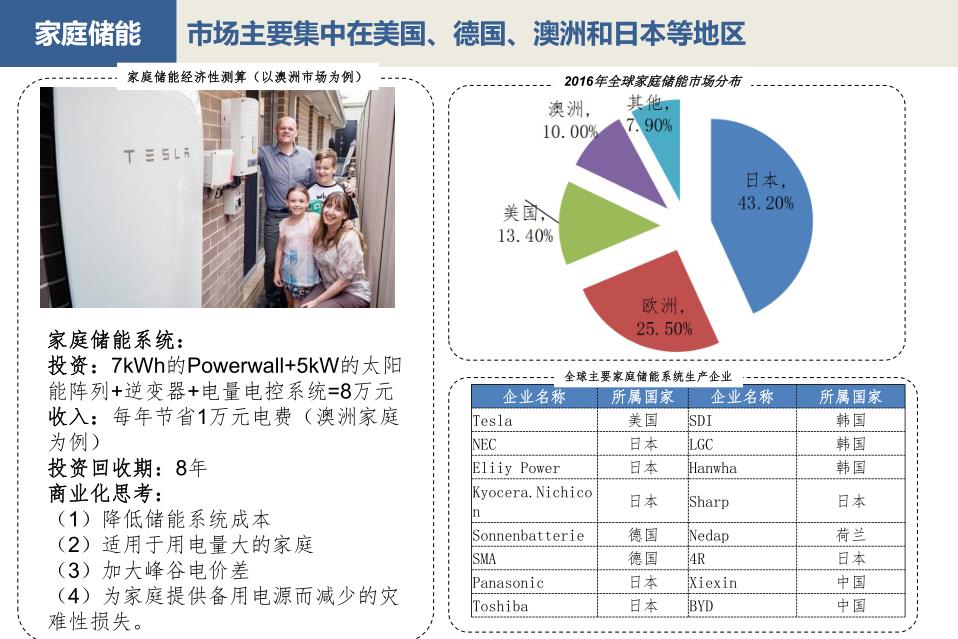 第一個是家庭儲能。在五年前日本的NEC就委托我們研究中國家庭儲能的市場,它對家庭儲能市場的定義是一個便攜式的移動儲能產(chǎn)品,你可以把它理解為是一個非常大的充電寶。尤其是現(xiàn)在在中國的一些地方,有些別墅或者說一些獨棟的這種,在用分布式的戶用光伏系統(tǒng),這樣的系統(tǒng)必須要配備一個儲能的電池。在澳大利亞、日本等國,很多地方的家庭都配備了這樣的家庭儲能產(chǎn)品,這個產(chǎn)品對他們的意義相當(dāng)于一個家用電器。也就是說,每個家庭買電冰箱、買電視的時候,也會買這樣一個家庭儲能產(chǎn)品。