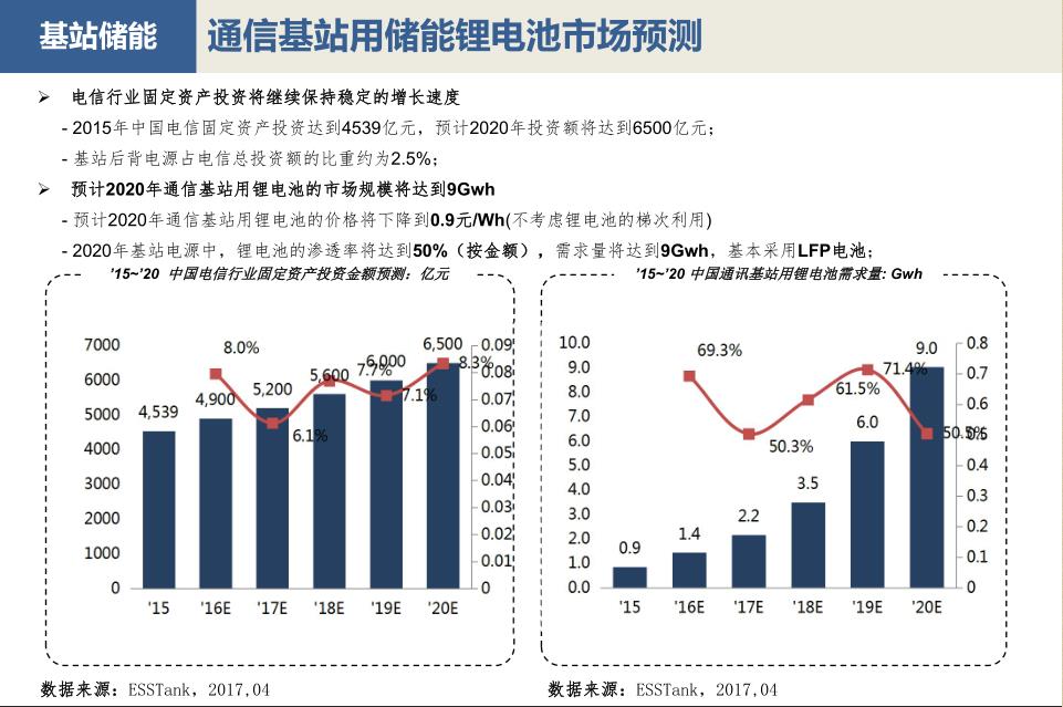 隨著通訊基站的配備,儲能的空間是很好去算的。首先,通過基站的投資額計算它的備用電源數(shù)量;其次,計算備用電源里面到底有多少是用鋰電池的。我們知道基站里面有鉛酸,有鋰電,還有新的燃料電池也在用。