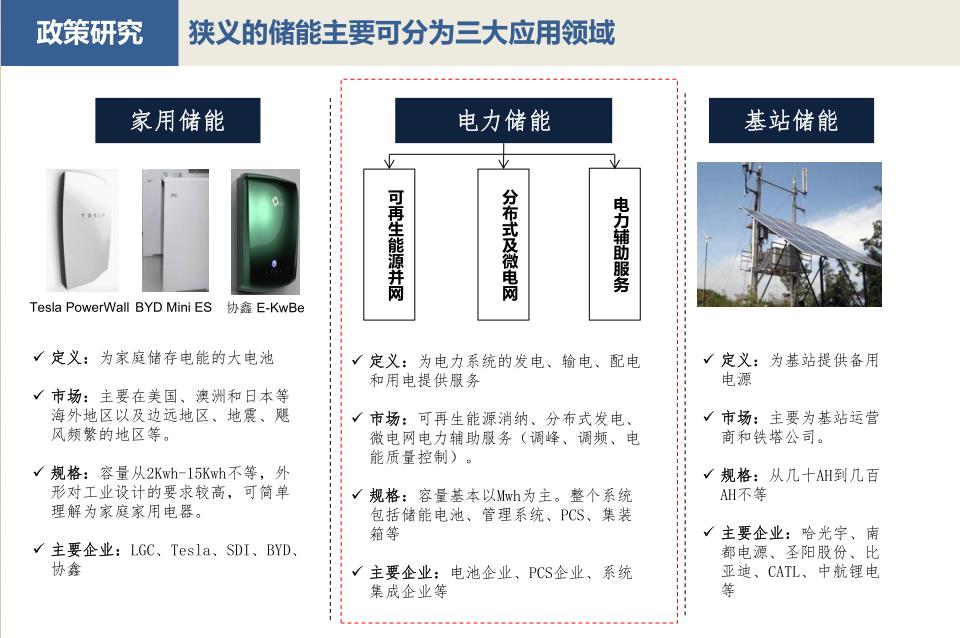 在研究儲能產(chǎn)業(yè)之前,我們還是要簡單地把儲能產(chǎn)業(yè)做個分類。廣義的儲能包括所有能夠儲存能源的載體,比如小的充電寶、大的移動電池。今天來講的儲能,說的是狹義的儲能概念,分為三個方面。