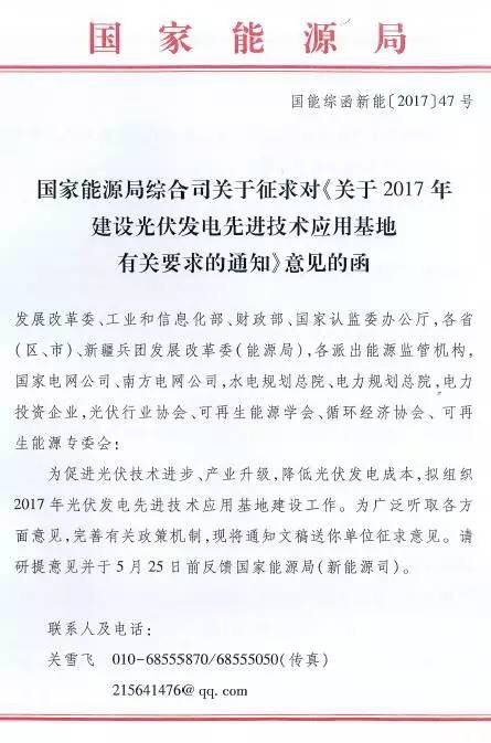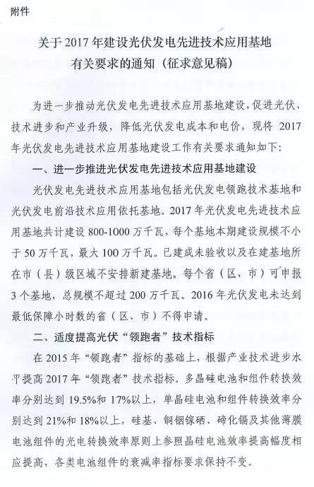 近日,華夏能源網(wǎng)獲悉,國(guó)家能源局綜合司發(fā)出了名為《關(guān)于2017年建設(shè)光伏發(fā)電先進(jìn)技術(shù)應(yīng)用基地有關(guān)要求的通知》的征求意見(jiàn)稿,對(duì)光伏發(fā)電先進(jìn)技術(shù)應(yīng)用基地建設(shè)的規(guī)劃、優(yōu)選、評(píng)分規(guī)則等做意見(jiàn)征集。