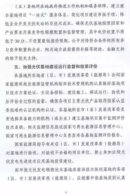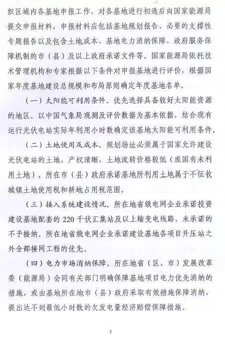 每個(gè)?。▍^(qū)、縣)可申報(bào)3個(gè)基地,總規(guī)模不超過(guò)2G瓦。2016年光伏發(fā)電未達(dá)到最低保障小時(shí)數(shù)的?。▍^(qū)、縣)不得申請(qǐng)。已建成未驗(yàn)收以及在建基地所在市(縣)級(jí)區(qū)域不安排新建基地。