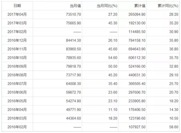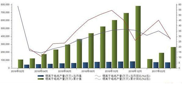 以下為2016年2月至2017年4月我國(guó)鋰離子電池產(chǎn)量: