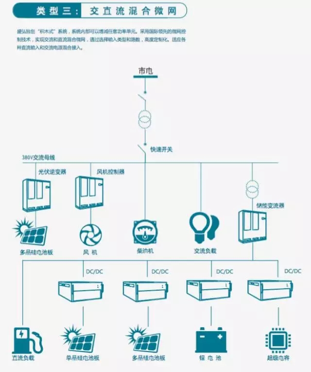 下面這個(gè)交、直流混合微網(wǎng)項(xiàng)目其實(shí)是盛弘電氣的一個(gè)深圳高校微網(wǎng)項(xiàng)目原型,該項(xiàng)目涵蓋了多種新能源發(fā)電設(shè)備和能量載體,包括50kW 10s超級(jí)電容、鋰電池、10kW多晶硅光伏、10kW單晶硅光伏、5kW風(fēng)機(jī)、柴油機(jī)、RLC模擬負(fù)載、交流負(fù)載、直流負(fù)載,是國(guó)內(nèi)首個(gè)僅靠一個(gè)核心的儲(chǔ)能 PCS 設(shè)備(50kW光儲(chǔ)一體變流器)就完成了交直流混合構(gòu)成的微網(wǎng)系統(tǒng),該系統(tǒng)既能實(shí)現(xiàn)部分層級(jí)的高效控制,同時(shí)又能保證整個(gè)系統(tǒng)的安全可靠性。