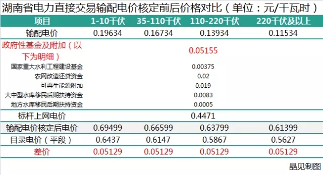 湖南省發(fā)改委于2017年1月1日便開始執(zhí)行輸配電價(jià)核定后的銷售電價(jià)。晶見計(jì)算得出,如果依據(jù)湖南省發(fā)改委關(guān)于省電網(wǎng)2017-2019年輸配電價(jià)有關(guān)問題中通知及其附件內(nèi)提到的“參與電力市場(chǎng)的用戶購(gòu)電價(jià)格由市場(chǎng)交易價(jià)格、輸配電價(jià)(含線損和交叉補(bǔ)貼)和政府性基金組成;未參與電力市場(chǎng)的用戶,執(zhí)行政府規(guī)定的電價(jià)”,參與直接交易的電力用戶或者售電公司就需要繳納比目錄電價(jià)更高昂的電費(fèi),差價(jià)將達(dá)到5.1分。
