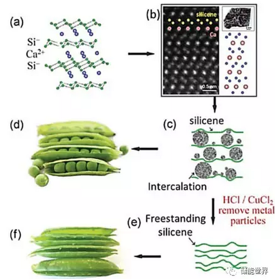 另外,利用固相法制備的硅烯中硅原子和鈣原子交替排列形成層狀結(jié)構(gòu),通過局部化學(xué)插層的方法把鈣移除,進(jìn)而得到獨(dú)立無襯底的硅烯。利用這種化學(xué)法制備的硅烯作為鋰電池的陰極,同時(shí)具有硅基材料的高容量和石墨材料的良好循環(huán)特性等優(yōu)點(diǎn),成為一種非常有潛力的鋰離子電池負(fù)極材料。