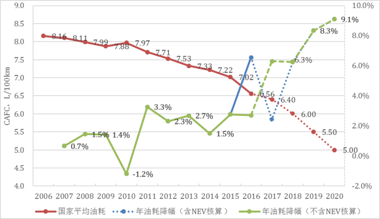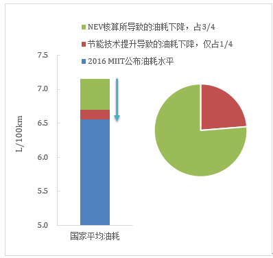2016年中國(guó)進(jìn)入油耗四階段管理,企業(yè)平均油耗核算方法發(fā)生了變化,新方法給予了新能源汽車(chē)非常大的核算優(yōu)惠,其中,產(chǎn)量上一輛新能源汽車(chē)可抵五輛傳統(tǒng)車(chē),油耗上新能源汽車(chē)按零來(lái)計(jì)算,如此核算,大幅拉低了一些生產(chǎn)新能源汽車(chē)企業(yè)的油耗水平,國(guó)家平均油耗的“核算”結(jié)果也因此下降了7%。但若除去新能源汽車(chē)的核算影響,傳統(tǒng)汽車(chē)平均油耗只不過(guò)下降了1.7%。依靠核算方法改變,引入新能源汽車(chē)帶來(lái)了超過(guò)5%的油耗下降,但實(shí)際節(jié)能并非如此。