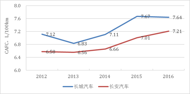 國(guó)內(nèi)兩最大SUV生產(chǎn)企業(yè)——長(zhǎng)城汽車(chē)與長(zhǎng)安汽車(chē),2016年產(chǎn)銷(xiāo)近百萬(wàn),遺憾的是過(guò)去四年兩家企業(yè)的油耗非但沒(méi)有下降,還不斷攀創(chuàng)新高,2016年兩企業(yè)油耗均不達(dá)標(biāo)。它們的產(chǎn)品結(jié)構(gòu)朝著大型化的SUV、MPV方向發(fā)展,而節(jié)能技術(shù)的應(yīng)用力度,遠(yuǎn)遠(yuǎn)沒(méi)能抵償因重量化所引起的油耗增長(zhǎng)。