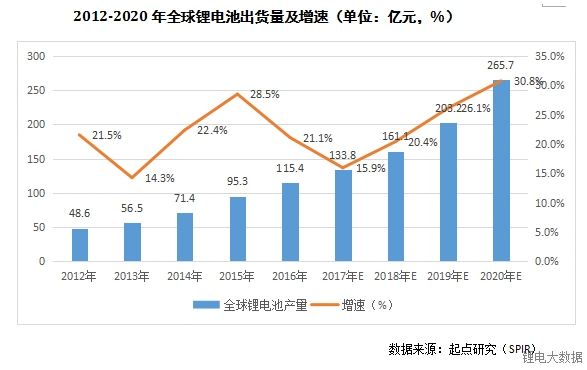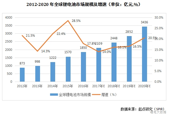 起點(diǎn)研究(SPIR)統(tǒng)計數(shù)據(jù)顯示,2016年全球鋰電池電芯產(chǎn)值達(dá)到1850億元,同比2015年增長17.8%。預(yù)計到2020年全球鋰電池電芯產(chǎn)值將達(dá)到3436億元。