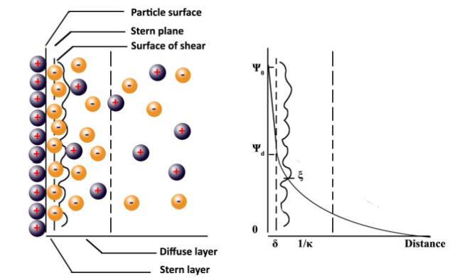 下圖為Stern雙電層模型,zeta電位(ξ,Zeta potential)為雙電層模型中極重要的參數,實際測量時并無法直接測得粒子的表面電位,但可由聲波法或是電泳法計算出粒子的zeta電位。雙電層模型中Stern 層與擴散層間的剪切平面上存在zeta電位。