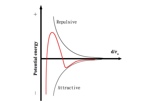 下圖為DLVO示意圖,表示膠體粒子之間存在吸引力與排斥力,這兩種作用力的大小決定膠體溶液的穩(wěn)定性,粒子間的吸引力為主要作用,則粒子將產生團聚;而排斥力大于吸引力的狀態(tài)下,則可避免粒子凝聚而保持膠體的穩(wěn)定性。