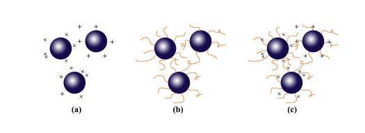 3)靜電立體穩(wěn)定作用(Electrosteric stabilization),穩(wěn)定機制如下圖所示: