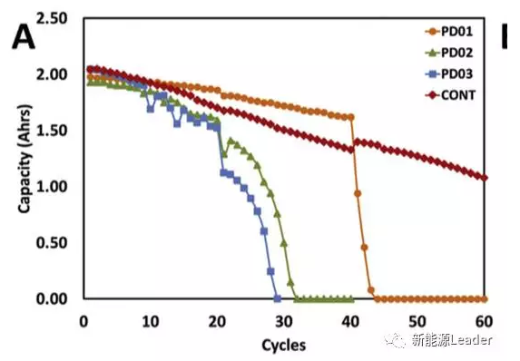 測試中YangGao采用了商用18650電池,正極材料為LiCoO2,負極材料為石墨,測試了不同的充電電流對電池衰降速率的影響,結(jié)果如下圖所示。從下圖a中我們可以看到,充電電流對于鋰離子電池衰降速度具有極大的影響,在0.5C充電倍率下,在前150次循環(huán)電池的衰降速度為0.020%/循環(huán),在150次-800次則穩(wěn)定為0.0156%/循環(huán),800次以后為0.0214%/循環(huán)。而0.8C充電倍率下,電池在前150次,衰降速度為0.0243%/循環(huán),150次-800次為0.175%/循環(huán),800次以后為0.0209%/循環(huán)。對于1C倍率充電,前150次衰降速率為0.032%/循環(huán),150次-600次衰降速率為0.0188%/循環(huán),600次以后衰降速度為0.0271%/循環(huán)。1.2C充電,前100次衰降速度為0.0472%/循環(huán),100次-400次衰阿醬速度為0.0226%/循環(huán),400次以后衰降速度為0.0356%/循環(huán)。1.5C倍率充電與其他倍率充電的電池具有很大的不同,平均衰減速度為0.078%/循環(huán),遠遠快于其他倍率下充電的電池。從上述數(shù)據(jù)可以看到,隨著充電的倍率的加大,鋰離子電池的衰降速率也在快速增加,并且從曲線的斜率來看,電池的衰降速度存在三個不同的階段,前期衰降速度較快的階段(階段1),中間衰降速度較慢的穩(wěn)定階段(階段2),和后期的衰降速率加速階段(階段3)。針對三個階段電池的衰降機理的研究認為,階段1可能是因為電池SEI膜生長需要消耗一部分Li+,因此衰降速度較快。在階段2隨著SEI膜結(jié)構(gòu)的穩(wěn)定,內(nèi)部較為穩(wěn)定,因此衰降速度較慢,在階段3隨著電池老化,開始發(fā)生活性物質(zhì)損失,電極活性界面減少,導(dǎo)致電池對于電流十分敏感。圖C是針對不同的截止電壓對電池衰降速度影響的實驗,從實驗結(jié)果可以看到,當把充電截止電壓提高到4.3V時會導(dǎo)致電池的循環(huán)性能急劇惡化,降低充電截止電壓可以有效的改善電池的循環(huán)性能。