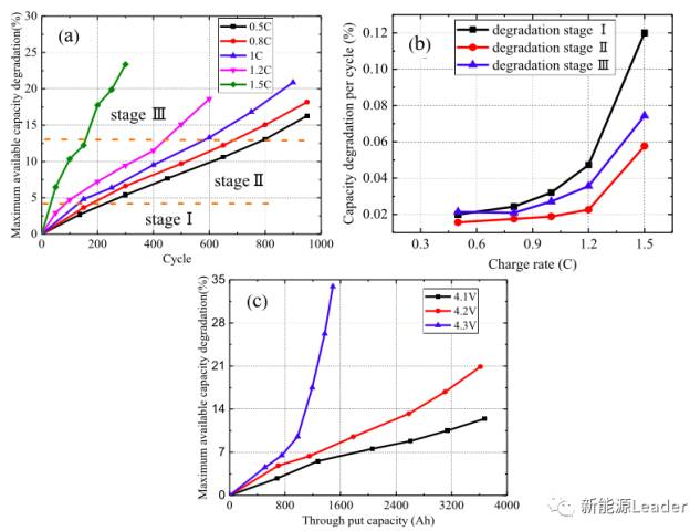 鋰離子電池的放電制度很大程度上依賴于使用者,好的放電制度對于有的使用者而言并不一定適用。但是充電制度則主要是設(shè)計者進行控制,因此對于充電制度對電池壽命衰降的影響的研究,能夠更好的指導(dǎo)我們對鋰離子電池的設(shè)計。北京交通大學(xué)的YangGao等[3]針對不同的充電制度對鋰離子電池壽命衰降的影響,并研究了其作用機理,提出了鋰離子電池的壽命衰降模型。YangGao的研究顯示,當充電電流和截止電壓超過一定的數(shù)值時,鋰離子電池的衰降將被極大的加速,為了降低鋰離子電池的衰降速率,需要針對不同的體系,選擇合適的充放電電流和截止電壓。