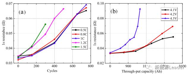 對電池的動態(tài)內(nèi)阻分析如下圖所示,從圖a測試結(jié)果來看,當充電電流小于1C時,電池動態(tài)內(nèi)阻隨著電池循環(huán)的變化趨勢幾乎時一樣的,但是當充電電流超過1C時,電池動態(tài)內(nèi)阻增加速度會隨著充電速率的增加而快速增加。從圖b的測試結(jié)果來看,當充電截止電壓為4.3V時,電池動態(tài)內(nèi)阻增加非常迅速表明高截止電壓會惡化電池的動力學(xué)條件,截止電壓為4.1V和4.2V時電池動態(tài)內(nèi)阻增加較為緩慢。