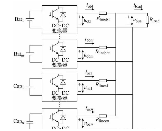 圖2 含m組蓄電池、n組超級電容的直流微網(wǎng)簡化模型