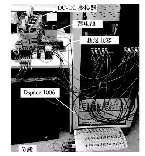 為對理論分析結(jié)果進(jìn)行實(shí)驗(yàn)驗(yàn)證,本文搭建了含有蓄電池/超級電容混合儲能系統(tǒng)的直流微網(wǎng)實(shí)驗(yàn)平臺,如圖8所示。LiFePO4電池、超級電容作為混合儲能系統(tǒng)的電源輸入,經(jīng)過雙向Boost DC- DC雙向變換器接入直流母線,為電阻負(fù)載Rload提供電能。