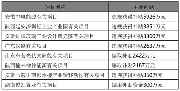 2013年6月,審計署公布《5044個能源節(jié)約利用、可再生能源和資源綜合利用項目審計結果》,其中8個違規(guī)使用資金的金太陽工程項目被查處,違規(guī)方式主要包括:編造虛假申報材料,套取、騙取資金;擠占、挪用資金用于生產(chǎn)經(jīng)營、業(yè)務經(jīng)費等支出;以“報大建小”、重復申報等方式違規(guī)獲得資金等。8個項目合計涉及違規(guī)補貼金額2.1億元。占參與抽查的金太陽工程項目資金總規(guī)模的2.58%,8個項目總規(guī)模64.298兆瓦,占被抽查總裝機規(guī)模的29%。