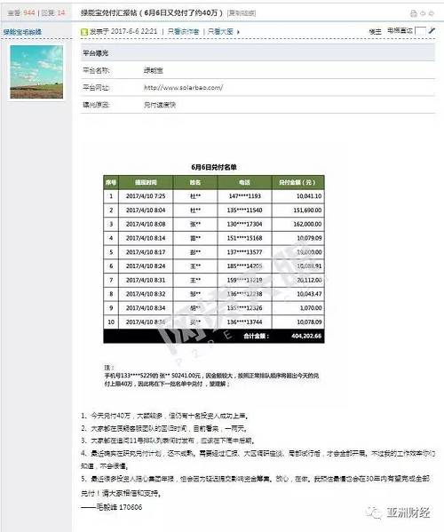 中國儲能網(wǎng)訊:6月6日,綠能寶臨時負(fù)責(zé)人毛毅峰在網(wǎng)貸天眼貼吧發(fā)表帖子稱,綠能寶在6月5日又兌付了約40萬,并且公布了6月5日的兌付名單。