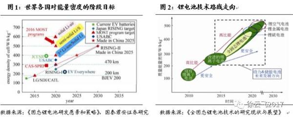 固態(tài)鋰電池有望成為下一代鋰電池發(fā)展的重要方向。世界各國先后制訂了高能量密度鋰電池的研發(fā)目標,日本政府率先提出“2020 年純電動汽車用動力電池電芯能量密度達到250Wh/kg,2030年達到 500Wh/kg”的目標。2015年11月美國USABC將 2020年電芯能量密度目標由原來的220Wh/kg 提高至350Wh/kg。《中國制造2025》確定的技術目標是2020 年鋰電池能量密度到300Wh/kg,2025 年能量密度達到400Wh/kg,2030 年能量密度達到500Wh/kg。