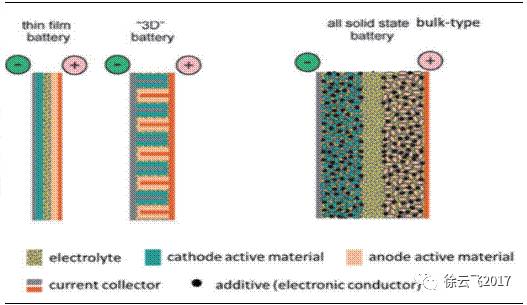圖4:全固態(tài)鋰電池結構:薄膜型(左1和左2)和大容量型(右1)