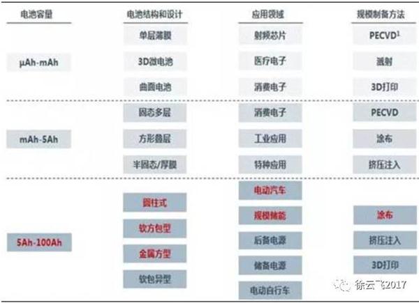 在工業(yè)應用領域需要用到方形疊層、厚膜等設計。薄膜性固態(tài)電池憑借強可塑性及高能量密度,可通過不同的電池結構、設計和相應的規(guī)模制備方法滿足應用要求,有望在這些領域形成替代。