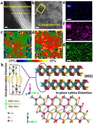 溫兆銀團隊在前期成功合成定向結(jié)構(gòu)三維二硫化鉬材料的基礎上(ACS Nano, 2015, 9 (12), 12464-12472. DOI:10.1021/acsnano.5b05891),采用低溫液相法成功地設計了層內(nèi)二硫化鉬/二硒化鉬異質(zhì)結(jié)構(gòu),通過與美國伊利諾伊斯大學合作進行的球差校正掃描透射電鏡分析證明了該層狀材料層間和層內(nèi)高度的晶格畸變,且沿相同晶面呈現(xiàn)間距不規(guī)則的特性,這種高度畸變的亞穩(wěn)結(jié)構(gòu)能夠顯著提升材料的催化活性。原位透射電鏡揭示了鋰離子在材料結(jié)構(gòu)中的快速穿梭和傳輸。此種高活性的催化劑首次成功地實現(xiàn)了金屬硫化物在鋰空氣電池中的穩(wěn)定深度循環(huán),具有潛在的應用價值。