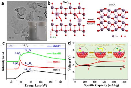同時,經(jīng)過兩年的努力,該團隊還在相關(guān)催化機理上獲得了突破。他們在成功制備超薄三氧化鉬納米片的基礎上引入氧空位缺陷,在電池的測試過程中,這種富氧空位正極材料呈現(xiàn)獨特的四個獨立階段的特征。針對這四個典型的過程進行深入分析發(fā)現(xiàn),在放電過程中,這些氧空位的活性位點可以形成局部的高濃度活性氧聚集點,與鋰離子發(fā)生反應形成穩(wěn)定的超氧化鋰類似物(Li2-xO2),當氧空位逐漸飽和后,在Li2-xO2表面逐漸形成穩(wěn)定的Li2O2放電產(chǎn)物。充電起始階段,Li2-xO2與氧缺陷位點可以作為Li2O2分解的高效催化劑,實現(xiàn)<3.5V的低充電電壓,而超氧化鋰能夠在~3.5V的電壓平臺快速分解,有效地降低了電池的充電過電勢。該項成果不僅解釋了氧空位缺陷在Li-O2電池充放電過程中的催化機理,同時放電產(chǎn)物自催化分解現(xiàn)象的發(fā)現(xiàn)可以為未來高效正極的設計提供新的思路和解決方案。
