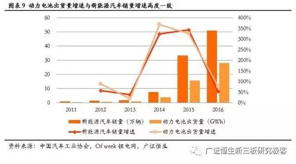 動力電池是指為新能源汽車、電動自行車等提供動力來源的電池,目前幾乎全部采用技術(shù)相對成熟的鋰電池。在國家能源戰(zhàn)略的指導(dǎo)規(guī)劃下,2014年以來新能源汽車相關(guān)政策集中出臺,加之國內(nèi)動力鋰電池技術(shù)不斷進步,整個產(chǎn)業(yè)鏈進入高速發(fā)展期。受到新能源汽車需求爆發(fā)的直接拉動,2014年以來動力電池出貨量也呈現(xiàn)同步高速增長態(tài)勢。