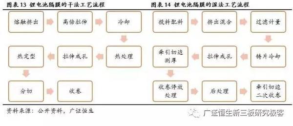 鋰電池隔膜的生產(chǎn)技術(shù)主要分為干法和濕法兩大工藝。干法工藝是將原料(PE或PP)進行高溫成膜后退火處理,進一步拉伸形成微孔膜;可細(xì)分為單向拉伸和雙向拉伸,其中干法雙拉工藝是中國科學(xué)院在20世紀(jì)90年代初開發(fā)出的具有自主知識產(chǎn)權(quán)的工藝。濕法工藝?yán)孟喾蛛x的原理,將小分子物質(zhì)與PE混合,加熱熔融后降溫進行相分離,得到微孔膜。