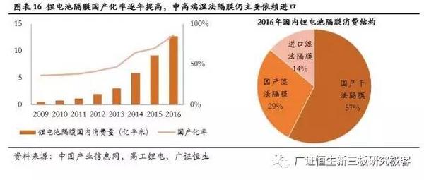 2016年隔膜國內(nèi)消費量數(shù)據(jù)顯示,隔膜的整體國產(chǎn)化率已經(jīng)達到86%;其中干法隔膜早已完全實現(xiàn)了國產(chǎn)化;而國內(nèi)濕法隔膜的出貨量也達到3億平米以上;但中高端濕法隔膜大多仍然依賴進口,60%以上中高端市場被日本、韓國、美國等國外隔膜廠商所占有。