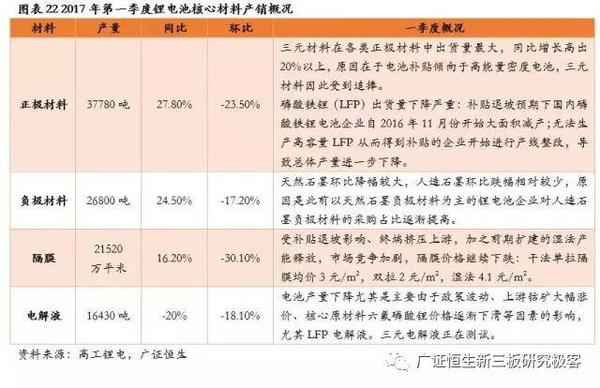 進入2017年以來,受到新能源汽車行業(yè)的補貼退坡、推薦目錄“重做”的影響,新能源車企的訂單派發(fā)都比較謹(jǐn)慎,因此整個鋰電池產(chǎn)業(yè)鏈的行業(yè)風(fēng)向、出貨量和盈利水平都受到了一定程度的影響,特別在鋰電池四大核心材料:正極、負(fù)極、隔膜和電解液等細(xì)分領(lǐng)域反映得十分顯著。2017年第一季度產(chǎn)銷情況相比2016年第四季度整體呈下滑態(tài)勢,但更加符合高能量密度動力電池要求的三元正極材料、人造石墨和中高端濕法隔膜表現(xiàn)更優(yōu)。